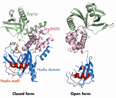 Fig. 65: Ribbon diagrams of the Dcp1p-Dcp2n complex in the closed and open conformations. Dcp1p is shown in green, the N-terminal domain (NTD) of Dcp2n in pink, the nudix domain of Dcp2n in blue and its nudix motif in red. In the closed conformation, the ATP molecule we observe in the active site is shown in a stick representation. |