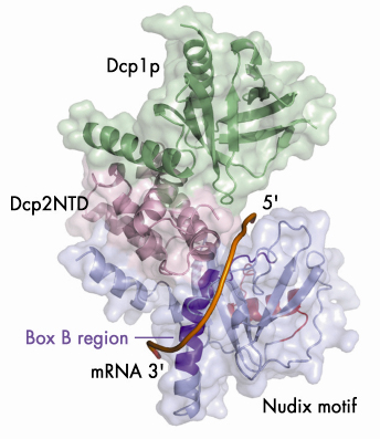 Removal of the 5’ cap structure is catalysed by the decapping complex consisting of at least two subunits: Dcp1p and Dcp2p. Dcp1p is a small protein containing an EVH1 domain, which is generally a protein-protein interaction module. The catalytic subunit, Dcp2p, recognises capped mRNA substrates and cleaves the pyrophosphate bond of the m7GpppN cap, releasing m7GDP as product. Dcp2p belongs to the nudix hydrolyase family, which contain the nudix signature nudix motif. The crystal structure of Dcp2p from S. pombe reveals that a conserved N-terminal region forms a two-lobed structure with an α-helical domain preceding the nudix domain [2]. That Dcp2p prefers longer RNA substrates suggests the presence of spatially separated RNA-binding and catalytic sites on the nudix domain, but the nature and site of the RNA binding domain of Dcp2p has not yet been determined. Additionally, despite the conservation of Dcp1p and its requirement for decapping, how Dcp1p interacts with and activates Dcp2p remains elusive.