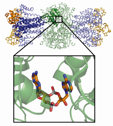 Fig. 67: Overall structure of Thermotoga maritima DisA. One protomer of the octameric assembly is shown in cartoon style: the N-terminal DAC (DUF147)-domain is shown in green, the helical central spine domain in blue and the C-terminal HhH domain in orange. The other chains in the octamer are shown as ribbons. The binding of cyclic-di-adenosine monophosphate at the interface of two DAC-domains is highlighted. |