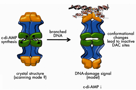 Fig. 68: Model for the mechanism of action of DisA in checkpoint control. In the absence of chromosomal damage (scanning mode), DisA synthesises c-di-AMP. Recognition of branched nucleic acids such as stalled replication forks or recombination intermediates might inhibit c-di-AMP synthesis thus signalling the presence of unsegregatable chromosomes. Several aspects of the model are speculative, such as the precise mode of DNA binding and the conformational changes shown. |