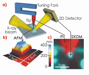 Fig. 34: a) Schematic of the experimental setup. b) Atomic force micrograph of a SiGe island. c) Superposition of simultaneous SXDM (blue) and PI (red) images. |