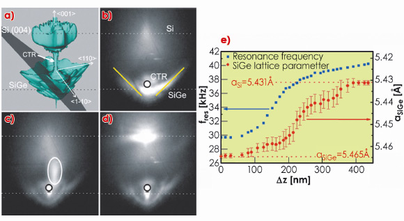 Fig. 35: a) Calculated 3D-RSM of an SiGe island in the vicinity of the Si(004) Bragg peak. The semitransparent plane depicts the interception of the reciprocal space by the detector plane for the images (b-d). b) 2D µXRD pattern of a non-compressed island. The flares (yellow lines) originate from the truncation rods of the island’s {111} side facets. c) and d) the same X-ray maps for different pressures. e) Variation of both the SiGe island lattice parameter and the tuning fork resonance frequency as a function of the piezo travel |