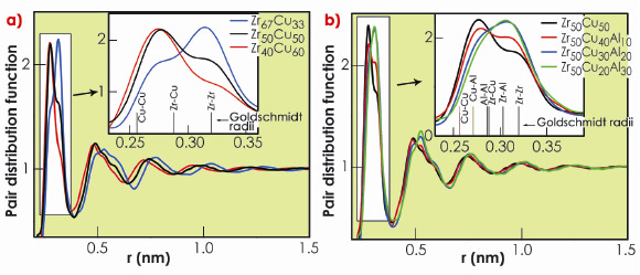 Fig. 46: Pair distribution functions for metallic glasses: a) Zr-Cu binary and b) Zr-Cu-Al ternary. Insets: close-up of the first PDF peak. |