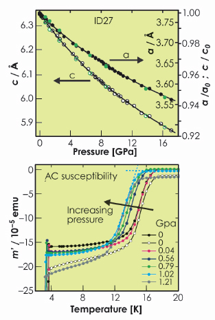 Fig. 56: The pressure response of the lattice parameters refined from ID27 data (upper) and the AC susceptibility (lower). |