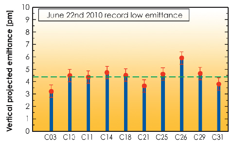During 2010, a new correction algorithm developed at the ESRF was successfully implemented. It was possible to correct coupling and vertical dispersion of the bare machine (i.e. at open ID gaps) with the available 32 corrector skew quadrupoles at unprecedented levels, yielding the lowest vertical emittance ever measured at the ESRF, 4.4 ± 0.7 pm (see Figure 154).