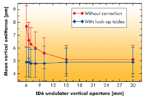 With closed (fixed) gaps, values between 5 and 7 pm are routinely achieved. To preserve low emittance against ID gap movements, two additional correction schemes were also conceived. The first consists of cabling the two steerers placed at the ends of a few straight sections as skew quadrupoles and to power them in order to compensate ID gap-dependent skew quadrupole errors by means of look-up tables. The red curve of Figure 155 shows the vertical emittance growth when the gap of the in-vacuum ID06 undulator decreases, while the blue curve demonstrates how effective this correction can be in preserving low emittance. This correction scheme has been applied to a single undulator segment and will be applied to a few more in 2011. Fortunately, the majority of the 70 ID segments in operation produce negligible residual coupling at all gap values. A further development was a separate coupling feedback to modulate the power of the 32 correctors in such a way as to correct the nearest coupling resonance in the tune diagram.
