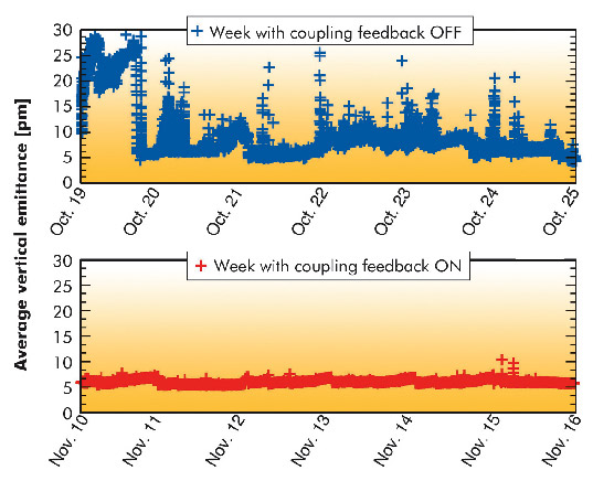 Figure 156 shows a comparison between two USM weeks with and without the coupling feedback: while large variations between 6 and 30 pm are observed in the later case, a rather stable vertical emittance between 6 and 7 pm was achieved during that week when the coupling feedback was on.