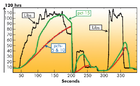 Fig. 157: Comparison of lifetime measurements made over a Machine Dedicated Time experiment during which the beam emittances were varied considerably. The measurement made from the sum signals from the Liberas is capable of diagnosing a 120 h lifetime over a few seconds while the conventional Parametric Current Transformers need several minutes of averaging to deliver a stable lifetime diagnostic. |