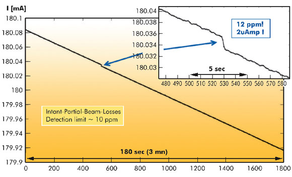 The most essential diagnostic in the storage ring of a third-generation light source is the beam position monitoring system and its associated orbit correction system. The quality of such systems largely determines the final beam stability, which is of utmost importance for many beamlines. The ESRF storage ring is equipped with 224 (32 cells x 7) beam position monitors (BPMs) located at regular intervals along the ring circumference. Each BPM station is constituted of 4 insulated buttons that capture weak radio frequency (RF) signals when the electron beam is passing through. The relative amplitudes of these weak signals depends on the position of the beam. The electronics processing these signals were replaced in 2009 with new units based on digital electronics (Libera Brilliance). This has already had far reaching and beneficial consequences for the beam quality, and further improvements can be expected in 2011. Indeed, the much lower noise in the beam position measurement has resulted in a greatly improved precision in the modelling of the linear lattice as obtained through transfer matrix measurements. The higher accuracy in the measurement of the lattice has resulted in a more effective coupling correction (less than 5 pm vertical emittance in USM as described above). A number of other applications of these electronics has been made or identified. The so-called sum signal of these 4 signals is proportional to the circulating beam current. Such a signal is only of real use if the whole chain of analogue and digital signal detection is of excellent stability. This appears to be the case of the Libera-Brillance units, if operated in a suitable way to maintain such stability. Averaging over the 224 BPMs results in a further reduction of the noise level by 15. This very low noise current monitor has resulted in a number of improvements in the monitoring of the beam in the storage ring. We have developed an improved lifetime measurement of the stored beam (see Figure 157), the capacity to diagnose instant micro-beam losses (see Figure 158) as well as an improved injection efficiency of the booster beam into the storage ring. Many other uses of the Libera electronics are under development, one of the most important being the fully renovated orbit correction system operating with all 96 steerers which will operate continuously from DC to 150 Hz.