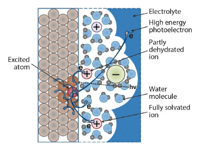 Generally, absorption of a high-energy photon by the electrode surface leads to numerous secondary events with an avalanche-type creation of low-energy excited electrons. In some cases, the energy of the electron exceeds the Volta potential difference, permitting it to escape from the surface to the electrolyte volume. In the case of cathodic polarisation, low-energy electrons emitted from the electrode surface can further reduce cations in the Helmholtz layer, while high-energy electrons pass through the electric double layer to the electrolyte volume (Figure 115). Thus, emitted photoelectrons generally produce an additional electric current at the electrode-electrolyte interface that involves electrochemical transformation. Unlike the radiolysis products, these electrons have no oxidising pairs, which obviously shifts the electrochemical equilibrium and enhances deposition rates on the illuminated areas of the electrode. The holes on core levels generated by X-rays move away from the electrode surface under the applied potential and annihilate effectively in the electrode volume. The circuit completes through electrochemical reactions on the anode.