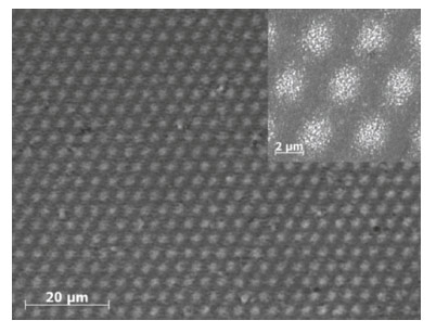Fig. 116: Top-view SEM image of the nickel electrodeposited onto an Au/Si electrode under periodic X-ray illumination. |