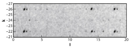 Fig. 117: X-ray diffraction intensities from a 40 μm magnetite grain at 90 K, shown for the h = 50 (hkl) plane. The microcrystal is almost single domain; faint spots to the right of the main intensities reveal the secondary twin. |