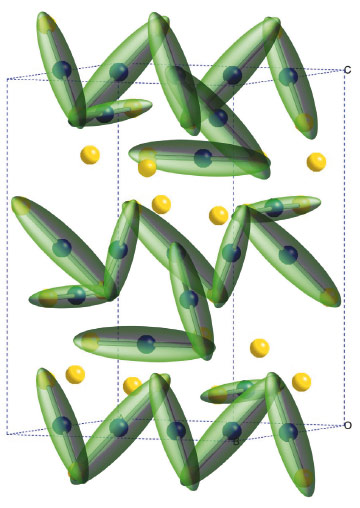 Fig. 118: Charge order in the low temperature structure of magnetite, with Fe2+/Fe3+ states shown as blue/yellow spheres and the three site trimeron units represented as green ellipsoids. |