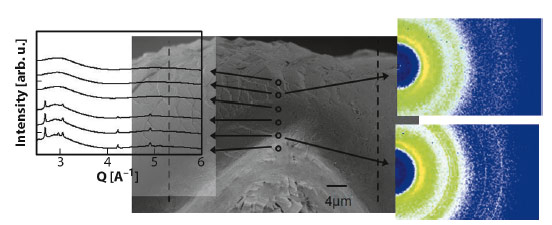 We performed non-destructive diffraction on a bent 35 µm thick glassy Pd40Cu30Ni10P20 ribbon in transmission geometry using a monochromatic beam at beamline ID11. The incident beam was focused to 2 µm in diameter for microprofiling across the bent specimen width every few micrometres along the thickness. Figure 119 shows the resulting X-ray microscopy images together with a scanning electron microscope (SEM) image of the bend in the ribbon. Crystalline Bragg peaks are seen to appear on the compressive fibre side of the bend but not on the tension side.