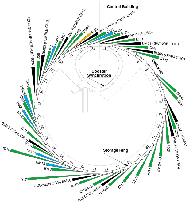 Fig. 157: Experimental hall with the operational and scheduled beamlines (public and CRG beamlines). |