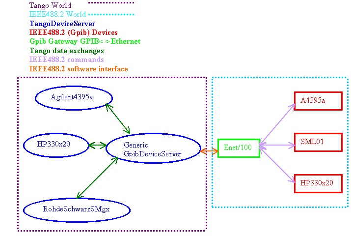 About the GPIB chain: The device is controled through it's gpib (IEEE 488.2) interface. The Agilent4395a tango device server does not access directly the 4395a. It's a client of another device server, the generic GpibDeviceServer. This architecture was choosen due to problem with concurrent access to the gpib bus, which wasn't enough secure, using lock/unlock commands. The GpibDeviceServer uses Tango serialisation mechanisms to avoid such conditions.