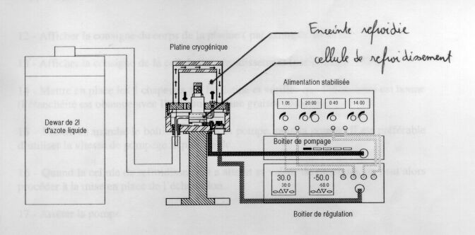 Cet ensemble cryogénique est essentiellement constitué d'une platine cryogénique équipée d'une cellule de refroidissement régulée en température et d'une enceinte refroidie. Le refroidissement de la cellule est réalisé par une circulation d'azote liquide au moyen d'un système de pompage constitué d'un vase dewar de 2 litres et d'un boîtier intégrant une pompe. Le contrôle en température de la cellule de refroidissement est assuré par un régulateur de température. Un deuxième régulateur en température est utilisé pour réchauffer le corps de la platine cryogénique éliminant ainsi les problèmes de condensation sur la platine.