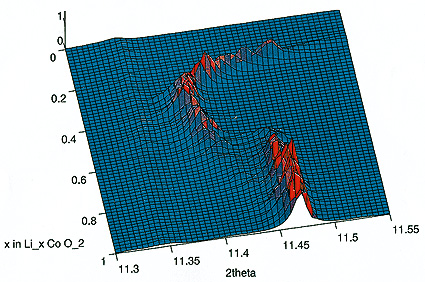 Fig. 125: 3D-plot of X-ray powder diffraction data showing the behaviour of the diffraction pattern of LixCoO2 as a function of the lithium content x.