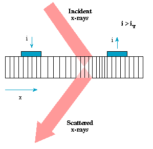 Fig.42: X-ray scattering from a sliding charge density wave (i >iT). The CDW is depinned between contacts but stays pinned below and outside contacts, leading to longitudinal CDW strain.