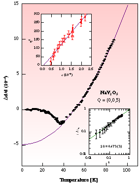 Fig. 48: Temperature variation of the relative change in lattice spacing d/d of NaV2O5 along [005]. The inset at bottom right shows the log-log plot of normalized strain