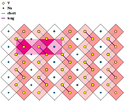 Fig. 49: Schematic representation of a possible model of the low-temperature modulated structure of NaV2O5 projected on to the a-b plane.