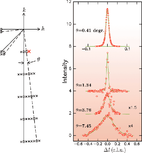 Fig. 104: The diffraction signal, red points, from the interface deformation field in X-ray scans perpendicular to the interface of bonded silicon wafers with twist angles . The left panel shows for both crystals the reciprocal lattice plane parallel to the interface and the red cross is the in-plane coordinate of the scans to the right.