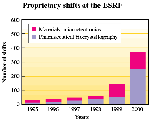 Protein crystallography data collection is still the main industrial proprietary activity at the ESRF, and it represents about half of the overall beam time purchased by companies (see graph below). The systematic scheduling of measurement slots (on BM14 and ID14 beamlines) for industrialists now facilitates rapid access. In the near future, the program for automated data collection, presently being launched in collaboration with the EMBL, will permit a decrease in the dead-time between two sessions of data collection on different samples. As a consequence, it should allow us to meet the need for greater rapidity due to the increasing demand for protein structures issuing from pharmaceutical companies and the genome project.