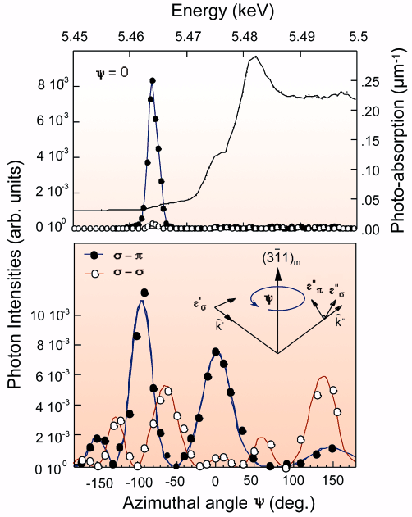 Fig. 55: Energy dependence of orbital reflection (3,-1,1)m (upper panel) and the relative azimuthal dependence (lower panel) in the two polarisation channel -