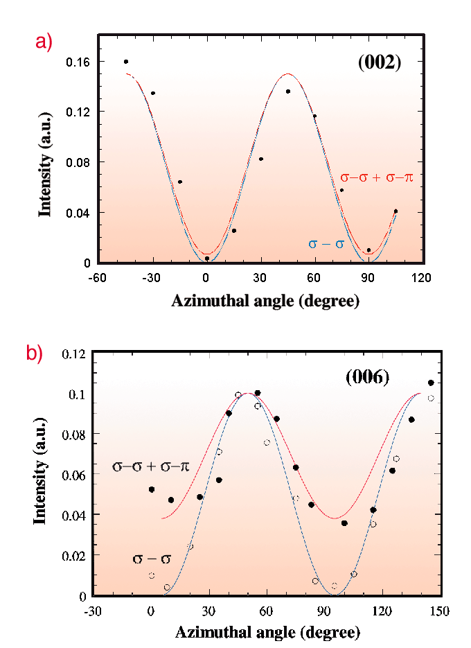 Fig. 63: Dependence of the integrated reflection intensity, at 7124 eV, as a function of the azimuthal angle , for the two reflections 002 and 006.