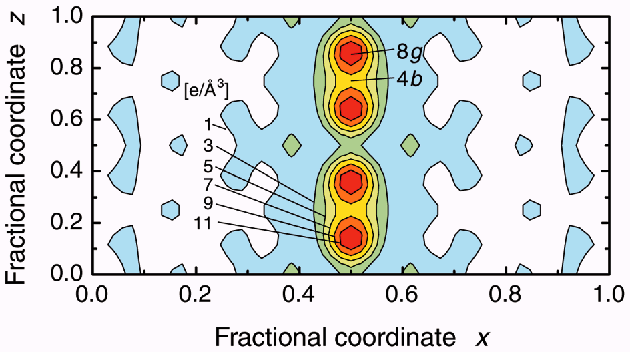 Fig. 84: Difference Fourier map of Rb-IV for a (010) plane. The x and z coordinates refer to the a- and c-axes of the tetragonal unit cell, respectively.