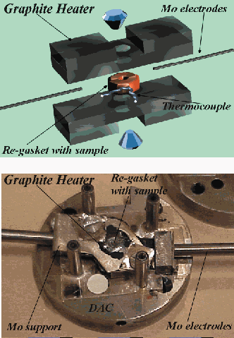 Fig. 85: Schematic diagram of a graphite heater (top) and the graphite heater mounted in the diamond anvil cell (bottom).