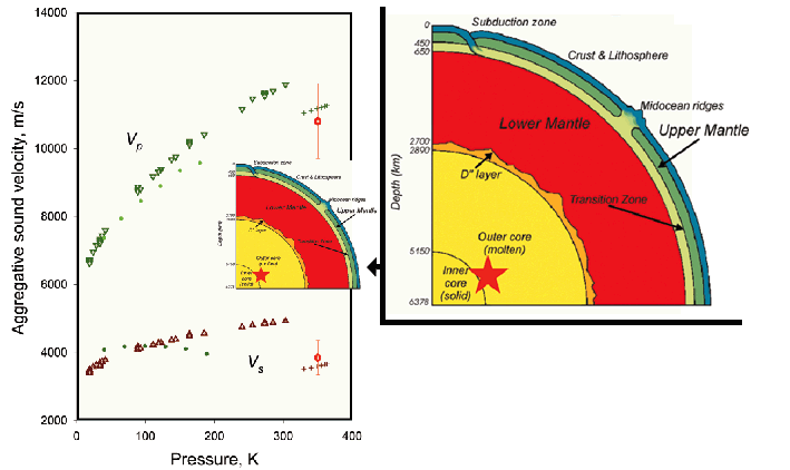 Fig. 86: Comparison of the present results (triangles) with shock-waves studies [1] (dotted lines), and with seismic observations (PREM) [2] in the inner core (crosses). Estimation of sound velocities for the inner core conditions (350 GPa and 6000 K) is shown by red hexagons. Thermoelastic properties and aggregate sound velocities of iron were studied up to conditions which correspond to the depth in the Earth interior marked by the red star in inset.