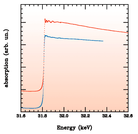 Fig. 87: XAS spectra at the Te K-edge in the solid (room temperature, red line) and in the liquid (730 K, blue line) state of KTe at 3 GPa.