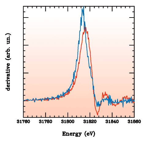 E of the absorption of solid (red line) and liquid (blue line) KTe at 3 GPa. The shift of the maximum of the derivative upon melting is due to the metallisation of the compound.