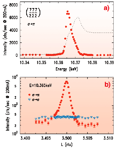 Fig. 67: Resonant X-ray magnetic scattering intensity associated with Gallium K edge in the antiferromagnet UGa3. a) Data points are integrated intensity as a function of incident photon energy. The dashed curve superposed is the fluorescence. The tabulated value of the Ga K edge is 10.37 keV, the data were taken at a temperature of 10 K. b) Intensity at a photon energy of 10.365 keV for the antiferromagnetic Bragg reflection as a function of the longitudinal wavevector [7/27/27/2], where these are coordinates in reciprocal space. The peaks occur at exactly the same positions as those from the uranium moments, and their narrow width (in q-space) indicates long-range real-space correlations. The higher background in the