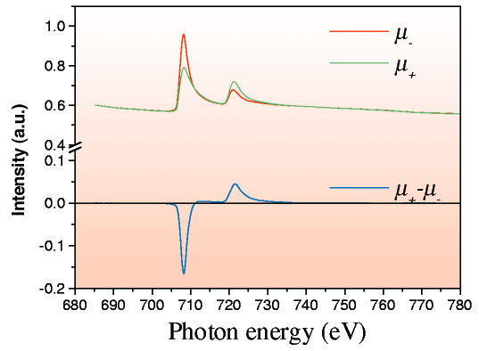 Fig. 68: Typical XMCD spectra for a coverage of 0.13 ML of Fe/Cu(111)-vic (total electron yield mode). µ+ and µ- correspond respectively to the geometry where the magnetic field has the same or opposite direction as the circular polarised light. This measurement has been made at normal incidence ( = 0°), T = 20 K and H = ±4 T.