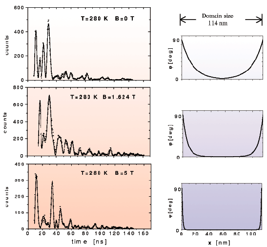 Fig. 71: Left panels: Time spectrum of nuclear specular reflection from a thin Fe3O4 layer in various magnetic fields. Right panels: corresponding orientation of the magnetic moments within a structural domain. j is the angle between the spin orientation and the magnetic field which lies in the sample plane. The measurement is only sensitive to the magnitude of .