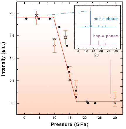 Fig. 74: Integrated intensity of the satellite of the Fe Kß line (open circles) compared to the -phase fraction determined by Mossbauer spectroscopy (Taylor et al., 1991) (solid circles) upon pressure increase. The later curve has been scaled to the low-pressure XES satellite intensity. The solid line is a guide to the eyes. The intensity of the XES satellite was calculated from the difference spectra obtained by subtracting the 230 Kbar spectrum from each scan. The plateau at low (high) pressure corresponds to the magnetic (non-magnetic) phase. The diffraction pattern measured in both phases, shown in the inset, confirms the structural change.