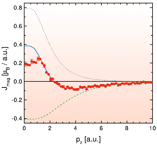 Fig. 75: The experimental magnetic Compton profile of SmMn2Ge2 (solid circles) at T = 40 K. The fit was performed for pz > 2 a.u., using RHF predictions for the Mn 3d (dotted line) and Sm 4f moment (dashed line), convoluted with a Gaussian with FWHM = 0.44 a.u. to represent the experimental resolution. The resultant curve is presented as a blue line.