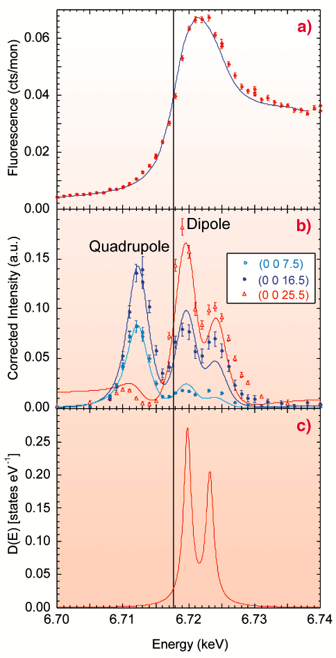 Fig. 79: Energy dependence of the fluorescence (a) and the resonance at three different magnetic reflections (b) at the L3 edge of samarium. Dipolar and quadrupolar resonances depend on the wave-vector transfer in a different way. The vertical line shows the position of the absorption edge. The solid lines in (a) and (b) are the result of a calculation using the model density of states (c).