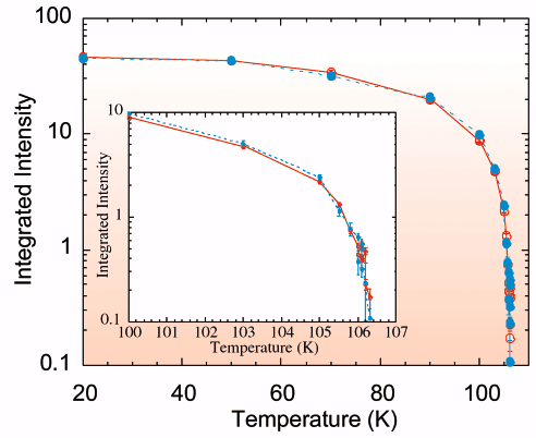Fig. 80: Temperature dependence of the (0 0 16.5) magnetic reflection at the dipolar and quadrupolar resonances, taken at 6.719 keV (full circles) and 7.712 keV (open circles) respectively. The dipolar intensities have been multiplied by 2.4 for easier comparison..