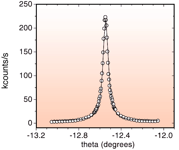 Fig. 43: Rocking scan around the surface normal from a Pt(111) crystal face at the minimum of a crystal truncation rod. The crystal was at room temperature and at an ambient pressure of 0.33 bar of CO. The peak counting rate is 222 kcounts/s over a background measured at the long tails of the scan of 2.5 kcounts/s. The full with at half maximum of 0.057° is indicative of the large (~200 nm) surface terraces.