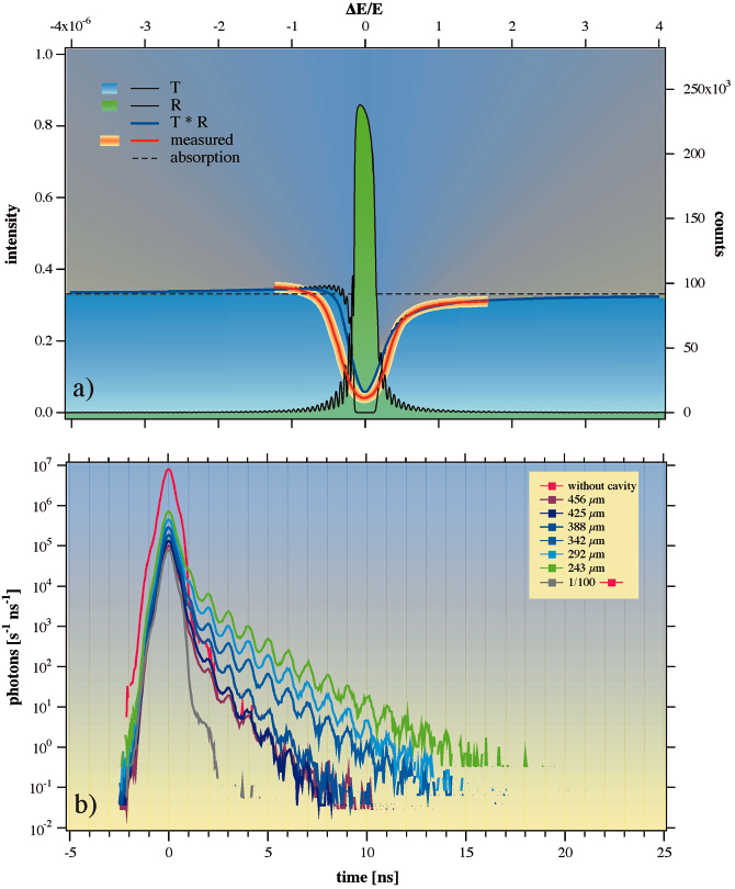 Fig. 132: a) Calculated reflection and transmission curves R and T of the cavity against energy deviation from the centre of the Bragg reflection. The monochromator delivers a similar curve to R. Thus the calculated curve for the simulation of an energy scan is the convolution T*R. Experimental data is consistent with theory for anomalous absorption, resulting in the asymmetry around the Bragg position. b) Time pattern of stored photons at the exit of the cavity at the minimum intensity of the Bragg reflection a). Without the crystal in the beam, only a direct bunch of photons is observed at time 0 while many bunches, originating from multiple back and forth journeys inside the device, appear when the cavity is in Bragg condition.