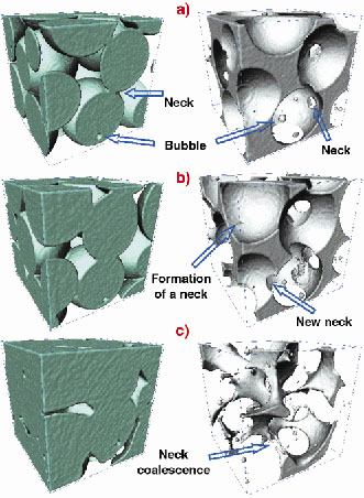 A 3D reconstructed image of a quarter of a sample in the initial state (pre-sintered) is presented in Figure 147. Grains appear as spheres lightly connected to each other which is the typical microstructure of a powder compact at the very beginning of sintering. More complete measurements have been obtained from a given sub-volume of the compact (200 x 200 x 200 µm3), extracted from the sample at different times. The 3D microstructural evolution of that sub-volume during sintering is illustrated in Figure 148, for the solid part (left) and the porous part (right). These views give an unprecedented description of the 3 stages of sintering. First stage (a): formation of necks between particles and grain rearrangement without pore elimination. Second stage (b): neck growth, changes in grain shape and pore elimination. Third stage (c): final densification and pore closure. Such images clearly depict the complex geometrical changes that take place all along the sintering process; the classical description of pores as cylinders in the intermediate stage is quite far from reality.