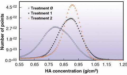 Fig. 139: Distribution of hydroxyapatite (HA) concentration in cortical bone for one patient before treatment (Ø), after one year of treatment (1) and after two years of treatment (2). |