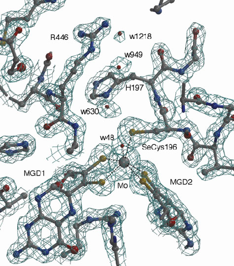 Fig. 1: Electron density map around the active site of Fdh-N at 1.6 Å resolution. |