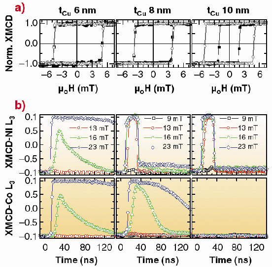Fig. 92: Static and dynamic measurements of Co/Cu/Ni80Fe20 trilayers: (a) Static hysteresis loops measured by XMCD for the Co (open dots) and Ni80Fe20 (squares) layers; (b) Dynamic response of the permalloy (top) and cobalt layer (bottom) to pulsed fields from 9 to 23 mT and width 30 ns.