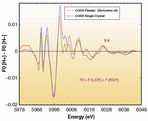 Fig. 106: Comparison of the XMD spectra recorded with a (001) Cr2O3 single crystal and with a powdered pellet for k //E//H. Note the 1:6 amplitude reduction factor for the powdered sample.