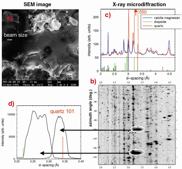 The two averaged powder patterns shown in Figure 162c were collected at sample positions that are 17 µm apart. The calculated positions of reflections suggest the presence of magnesian calcite, diopside and quartz. The strong 101 quartz reflection (red curve of Figure 162c) is clearly visible as a prominent single crystal reflection (Figures 162b and 162d). The present data demonstrates that with sub-micrometre beam sizes the signals from small amounts of a rare component can be detected and discriminated against the strong contributions of quartz or calcite.