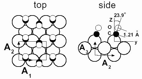 Fig. 64: Top and side views of the CO/Ni(110) 2x1 structure. A1, A2 and A3 are the lattice vectors used to describe the crystal lattice. A1 = A3 = a0/2 ( a0 = 3.524 Å is the lattice constant on Ni) and A2 = a0. The rectangle shows the 2x1 unit cell. The tilt angle and bond lengths of the adsorbed CO molecules are those obtained from the fit of the data set at 2.3 bars of CO. In reciprocal space, H, K and L are coordinates parallel to A1, A2 and A3 respectively.